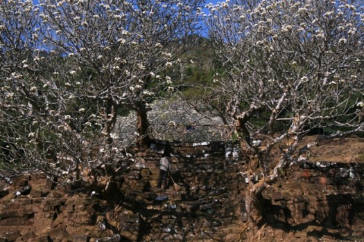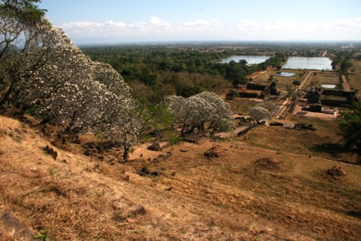 A processional way leads through the Wat Phou temple complex, passing between large baray or ceremonial ponds before climbing steps steeply up the hillside up to the sanctuary itself. The steps were lined with flowering frangipani trees so voluptuously aromatic that you could almost eat the air with a spoon. Pleasingly – or should I say, smugly – I seemed to be the first to arrive. First, apart from a few locals who were setting up their pitches at the top selling shrine offerings and soft drinks. With the place to myself, I made a leisurely tour of the sanctuary, originally Hindu, now Buddhist, seeking out the sacred Shiva spring, the rock-carved elephant and crocodile, and the library. I never did find the Buddha’s footprint but it was a pleasure to survey the shimmering plains below from this breezy elevated viewpoint beneath the deep shade of mango trees.