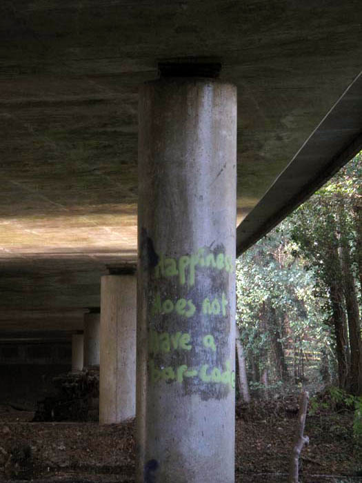 From the car park where the walk begins, a path leads to the river next to the medieval bridge that once marked the principal route into Norwich from the south. There is an attractive white wooden mill house here, a gushing weir and a NO FISHING sign. The path follows the river under a flyover that carries the bulk of traffic into the city these days – at weekends, a constant buzz of cars speeding into Norwich for retail therapy. Compared to the fine curves and warm sandstone of the nearby bridge, this has all the charm of a multi-storey car park: quotidian concrete and murky, permanently shaded water sheltering that ubiquitous creature of the urban waterway – a supermarket shopping trolley. A Ballardian microcosm, this edgeland non-place provokes an interruption in the pastoral flow of the walk; a frontier to be crossed (or underpassed) before continuing along the riverbank beyond. The smooth round pillars that hold up the flyover are splattered with spray-can ciphers – warnings and portents perhaps? A couple spell out ANARCHY, or words to that effect. Another graffito, more considered, pronounces HAPPINESS DOES NOT HAVE A BAR-CODE.