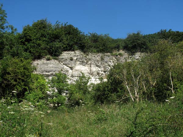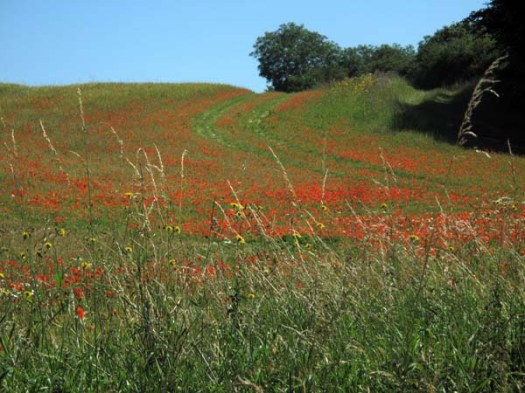 A mile or so later, following a short interlude along tractor-rutted farm-tracks, I climb gently up to a point where I can see the evocative ruin of St Andrew’s Chapel across the fields. Dropping down again, I soon reach the eastern end of Ringstead Downs. A large chalk-built barn and stark white cliff face serve as a reminder that this corner of the county is where the underlying chalk comes right to the surface. This, terminating in the striated chalk and carstone cliffs of Old Hunstanton, is the northern end of a seam of chalk that cuts diagonally southwest to northeast through southern England – the geological marker of the miscellany of paths that once constituted the Icknield Way. Chalk generally brings a gift of rich flora and Ringstead Downs, a shallow valley with the scarp slope on its northern side, does not disappoint. Thyme, eyebright, vervain, centaury and the charmingly named squinancywort are all to be found here: jewel-like miniatures that embroider the grass with pointillist spikes of colour. It’s humid and warm – a chalk valley microclimate; microscopic storm flies find their way through hair to scalp. There’s no breeze and little extraneous noise other than the summery coo of pigeons in the trees and the well-nourished buzz of satiated bees. Butterflies sip nectar; a buzzard swoops before flying off into the woods that flank the down’s eastern limit; a group of peahens – hardly native – screech alarmingly as they waddle for cover in the trees.