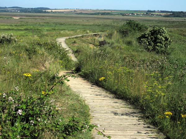 The coastal path crosses the marshes to reach a staithe before following the line of sea defences all the way west to Holme-next-the-Sea. At Thornham Staithe, and later at Holme, the busy car park exerts a curious gravitational effect that seems to prevent the majority of its visitors ever breaking much beyond its orbit: home, car, car park, beach, picnic, swim, car park, car, home. Nothing wrong with that of course, it allows the rest of us  to have the paths to ourselves most of the time. A boarded walkway leads over the top of the dunes to reach the beach at Holme-next-the-Sea, then briefly plummets through the deep shade of pines at the bird reserve before continuing between beach and marshes as the coast tips southwards towards Hunstanton. Pipits rise in alarm from the path in my wake; pyramidal orchids, slightly past their best, dot the sandy hollows in magenta clusters; yellow ragwort is everywhere.