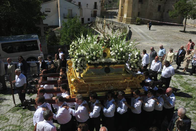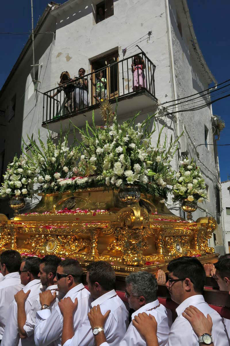 Musicians carrying trombones and drums saunter across Plaza de la Constitución to assemble outside the main door of the Iglesia del Carmen that overlooks the gorge. Eventually, the congregation files out of church and after a fanfare of deafening fircrackers the procession leaves to make its way around the town’s narrow streets. Leading the entourage along with the priest are girls in white dresses carrying baskets and boys in sailor suits, then comes the heavy wooden float carried on the shoulders of a rota of 28 men followed by the band and what seems like most of Alhama’s population dressed in their Sunday best.