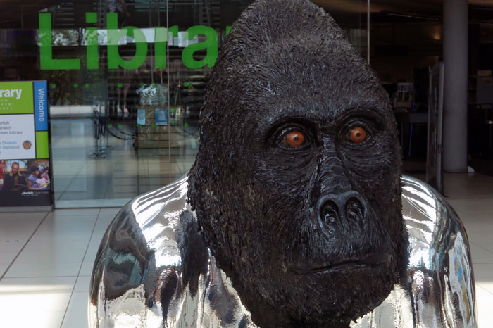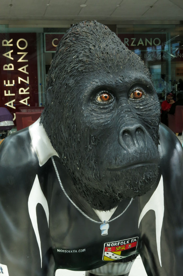 Over the past few days a large number of gorillas have taken over Norwich city centre. No leaf-munching friends of David Attenborough these, the Norwich gorillas are fibreglass but compensate for their inanimate nature by coming dressed in a wide range of outlandish outfits. The splendid beast above – ‘Chromilla’ – can be found in front of the library in The Forum.