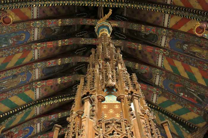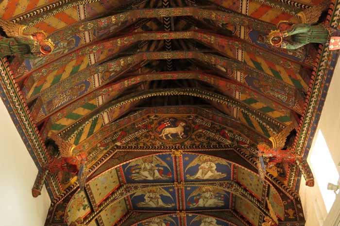 There may be those who will find the roof decoration here far too bright for their taste – the colours are brilliant and vibrant, the overall affect almost psychedelic. But if you have a plentiful supply of pound coins – there is a cash-hungry slot for inserting coins to supply short-lived electrical illumination – you can see for yourself the sort of church decoration that might have held illiterate medieval peasants in awe. True, Mildred’s work was a Victorian makeover but it was probably quite faithful to the original paint job – the bling of medieval church decoration was often far more garish than many of us imagine it to be.