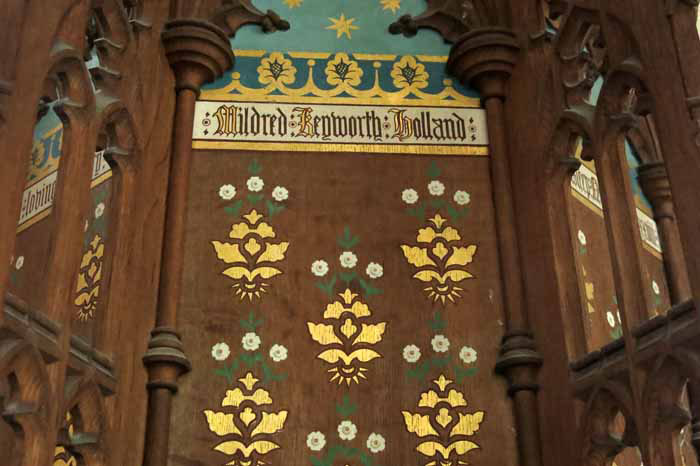 thank you to tell the story of Mildred. Besides the Victorian zeitgeist of her age I think she got it quite right. Most of those midieval painting were quite naiv and the colour was quite bright because colour was symbolic communication and at least as important as the figures. And one can see on your fine photographs that medieval was serial. I think Mildred got all this quite right, although the decorations are more Victorian. Now you made me curious to visit this church.
