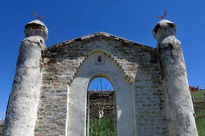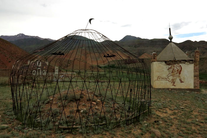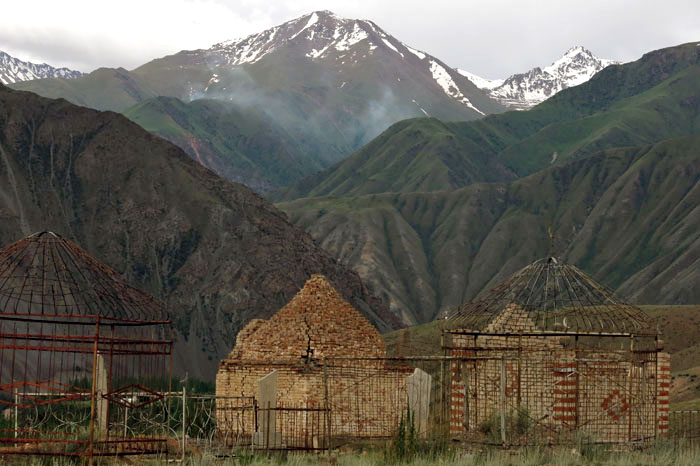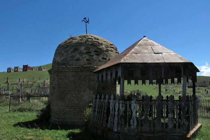 You see them everywhere in Kyrgyzstan. From afar they resemble hillside villages of mud-brick dwellings but a closer look reveals them to be cemeteries. Usually located a little way outside a village, sometimes on top of a low bluff, they are often more impressive than the villages they serve. With a mixture of mud-brick, shrine-like tombs, gravestones with etched images of the deceased, and Islamic crescent moons intermixed with communist five-pointed stars, they represent an odd amalgam of funerary styles. What makes them unmistakably Kyrgyz, though, are the large, wrought-iron, yurt structures that mark many of the graves.