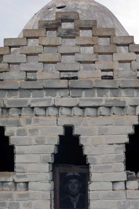 A nomadic people until well into the 20th century, the Kyrgyz used to be buried without fuss wherever they died. Although important nobles and warriors were sometimes honoured with showy mausoleums, most Kyrgyz graves were simple and basic. However, when this nomadic lifestyle was forcibly abandoned during the Soviet period the erection of large memorials to the dead started to become fashionable with the newly sedentary Kyrgyz. It may seem ironic that a wandering people like the Kyrgyz should choose such an earth-bound dwelling after death but a new practice emerged in the 1930s of erecting monuments that recalled their former nomadic lifestyle. As well as the wrought-iron yurt frames that reflected nostalgia for the old way of life, etched portraits – a Russian custom – also started to feature on gravestones. Traces of an altogether more ancient culture became prevalent too: the tradition of pre-Islamic shamanism in which antlers, animal skulls and horses’ tails are used to decorate tombs.