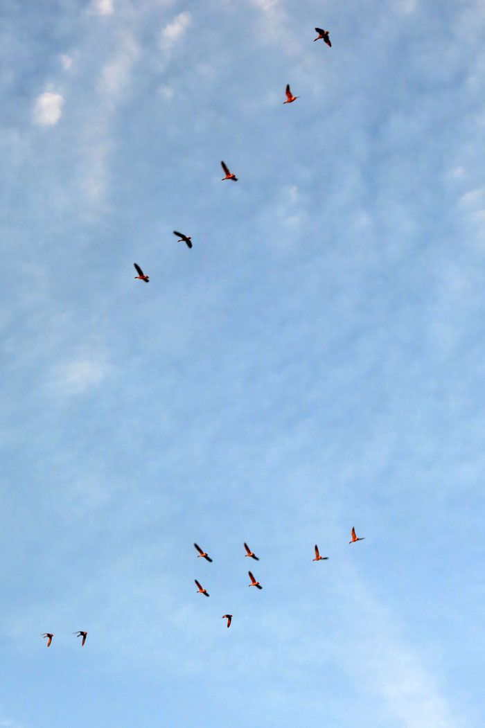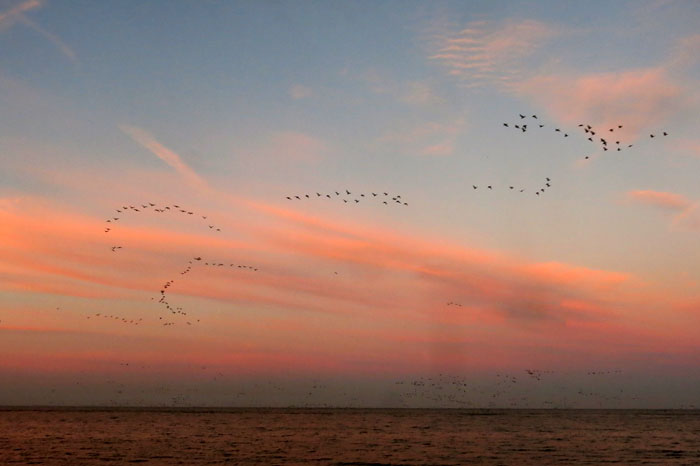 The sun rises over the land, a brilliant orange fire that lights the birds as they fly over head, turning their underbelly pink, orange, red. Momentarily they almost resemble flamingos.