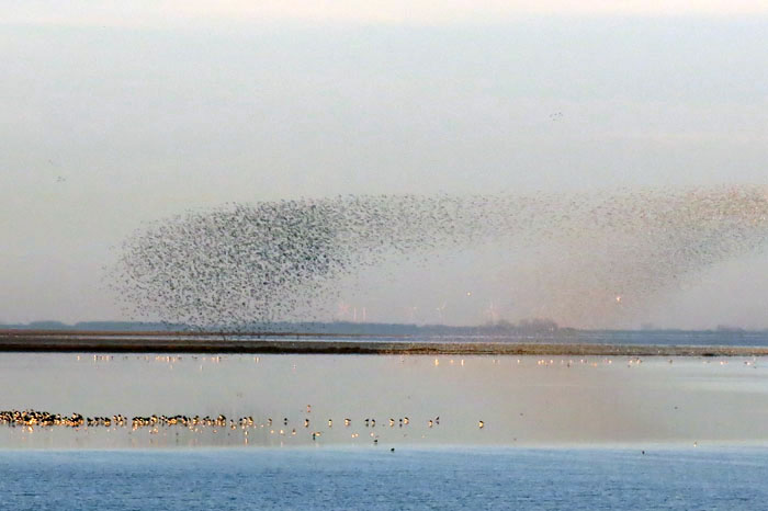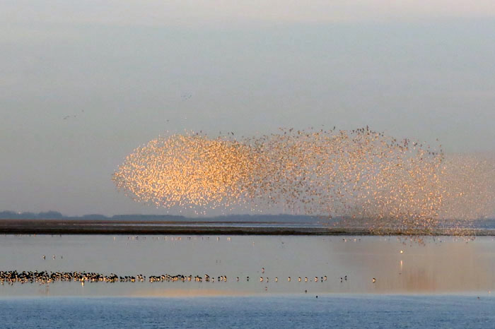 IMG_3244The tide is turning quickly and hidden sandbanks are revealed as the unseen moon sucks water from the land. As dawn-pink drains from the sky our attention is drawn to an untold number of hyperactive waders a little way to the south. Mostly dunlin, curlew and knot, it is the latter, another Arctic winter visitor, that are the most extraordinary as dense clouds of them rise sporadically into the sky, tightly grouped like starling murmurations. As they swiftly weave and turn, shifting the angle of their wings, the colour of this mass organism transforms dramatically from black to white to golden – the avian equivalent of a firework display. Such fleeting serendipity of form and colour: a photograph can hardly do this justice. As with the pink-footed geese, the Arctic’s seasonal loss is Norfolk’s gain.