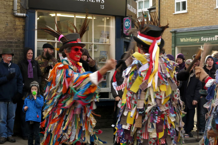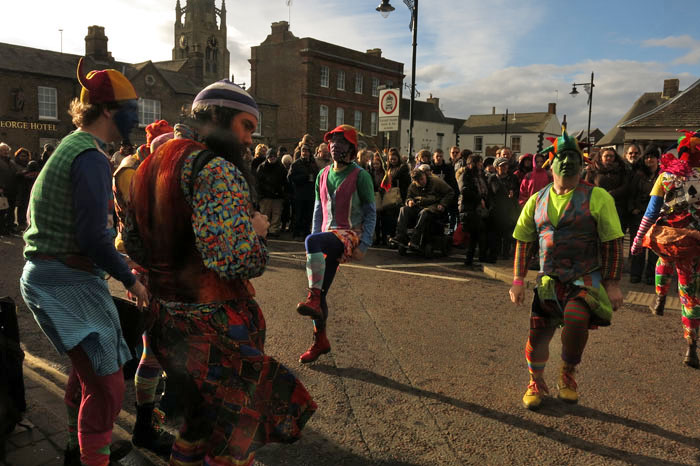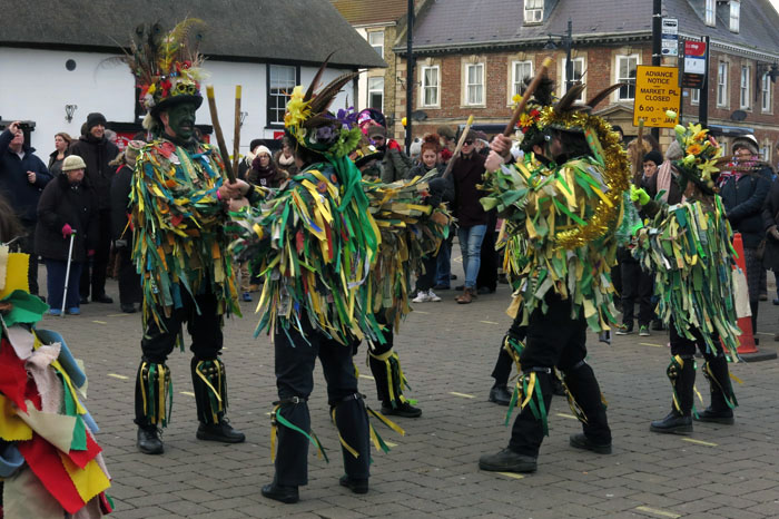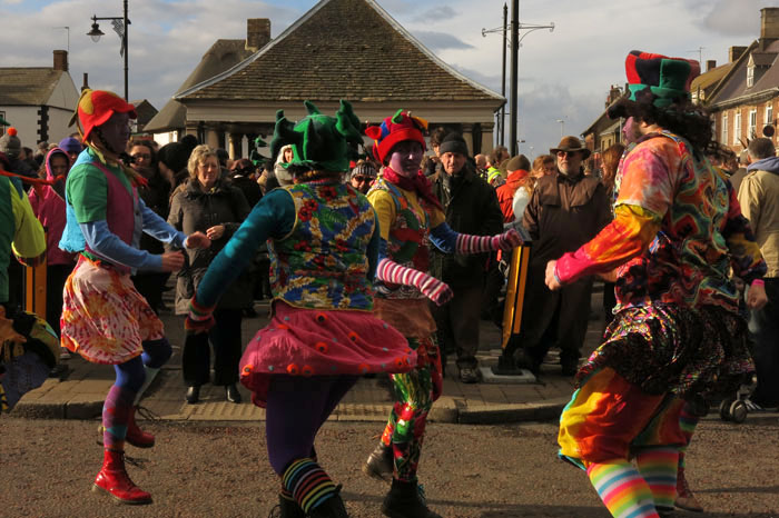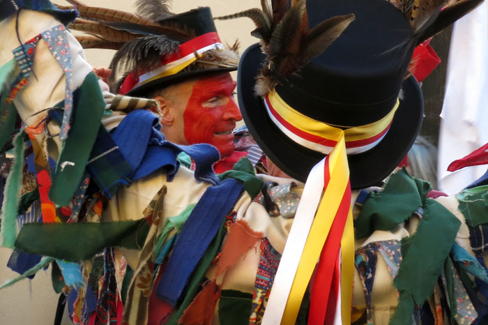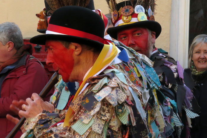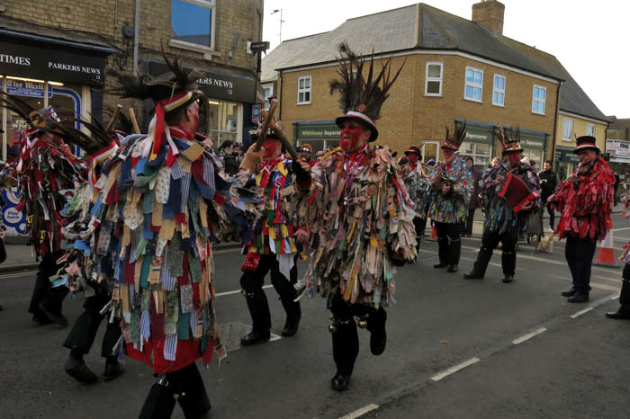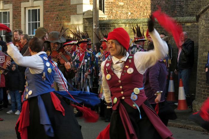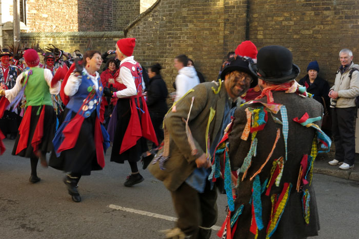 Whilst clearly revivalist, the modern festival has a vigour and joie de vivre that is at odds with the sombre post-Christmas, mid-winter gloom that tends to characterise this time of year. Perhaps its joyous atmosphere has a lot to do with  the unselfconscious high spirits of the English whenever they get a chance to dress up in silly clothes and clown around. Such behaviour is aided and abetted by widespread music and dancing by brightly costumed dancing sides that go under exotic monikers like Gog Magog, Pig Dyke, Old Glory and Ox Blood Molloy, Kemps Men Morris, Red Leicester, Pretty Grim and Black Pig Border Morris. The fact that all of the town’s pubs are open all day really does not hurt either.