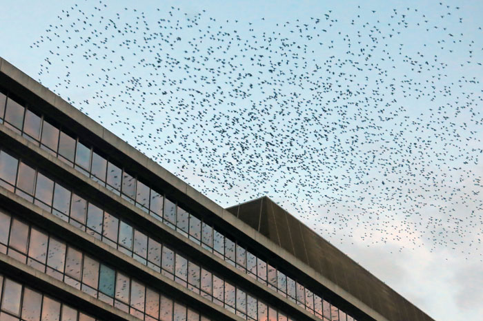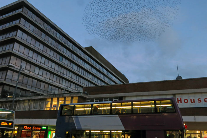 For many of the shoppers and workers hurrying home on the bus this phenomena takes place virtually unnoticed. Even so, there are those who stop to look and wonder at such wild exuberance in what is to them a familiar and quotidian urban environment. While shopping is bought and buses are boarded in the street below the massed starlings dance above – a joyous ensemble piece that twists and turns like a single organism, choreographed by some sort of instinctive group consciousness. As the light fails the birds finally settle, with what seems like a collective spontaneous decision, on the roof of a disused office building where they will spend the night. Darkness falls: the spectacle is over for another day.
