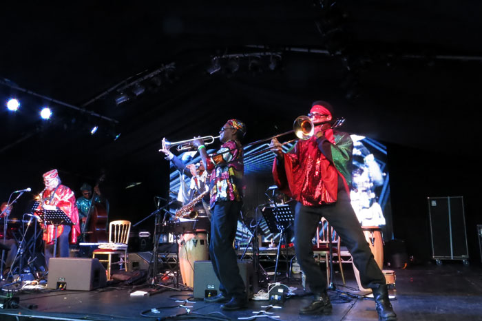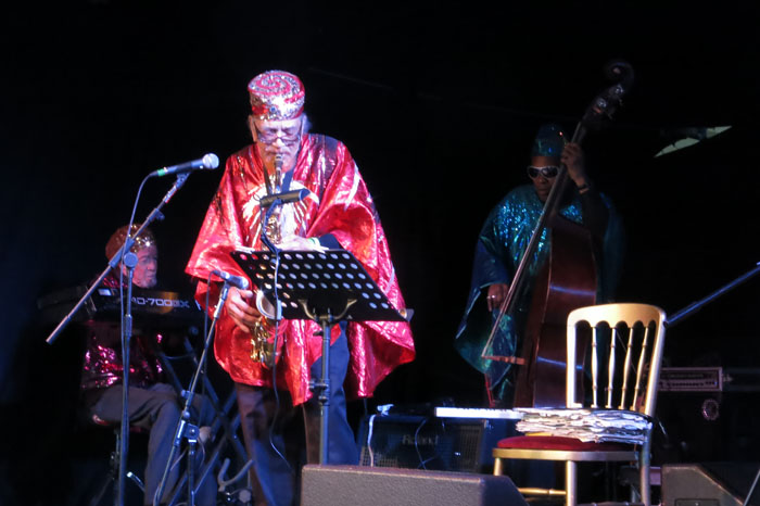 I had seen the Arkestra perform last year at London’s Barbican Centre when they celebrated their erstwhile leader’s centenary. They were good but somehow it seemed that they did not quite gel musically on that occasion. At Lunar though, they dazzled, segueing from one tune to another, Marshall Allen directing his cohorts with hand gestures, ear-whispers and alto sax squeaks. Despite a playful sense of humour and the faintly ridiculous galactic-warrior outfits sported by the Arkestra players, the music they generated was deadly serious: spontaneous, risky, and on occasion quite unsettlingly beautiful. At times the music seemed to teeter on the edge of anarchy but it was usually only a brief time before the band swiftly gathered itself together to swing into another languid yet skin-tight ensemble passage. It has sometimes been dubbed ‘space-jazz’ or ‘afrofuturist’ but to accurately describe the scope of the Arkestra’s music is a futile endeavour – never has the dictum ‘Writing about music is like dancing about architecture’ seemed more apposite. There were a couple of tunes I recognised: “Saturn”, I think, and “Angels and Demons”, and near the end of the set we were treated to a superb straight-ahead blues in which everyone took a solo and the Arkestra seemed momentarily to almost be a normal sort of jazz band, albeit one where the adjectives ‘left-field’, ‘spacey’ and ‘psychedelic’ still seem to be wholly appropriate.