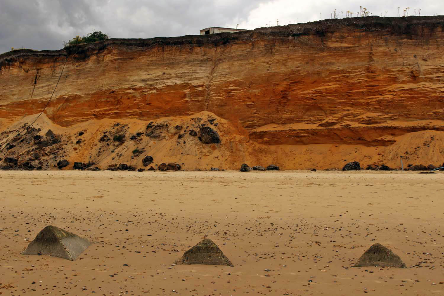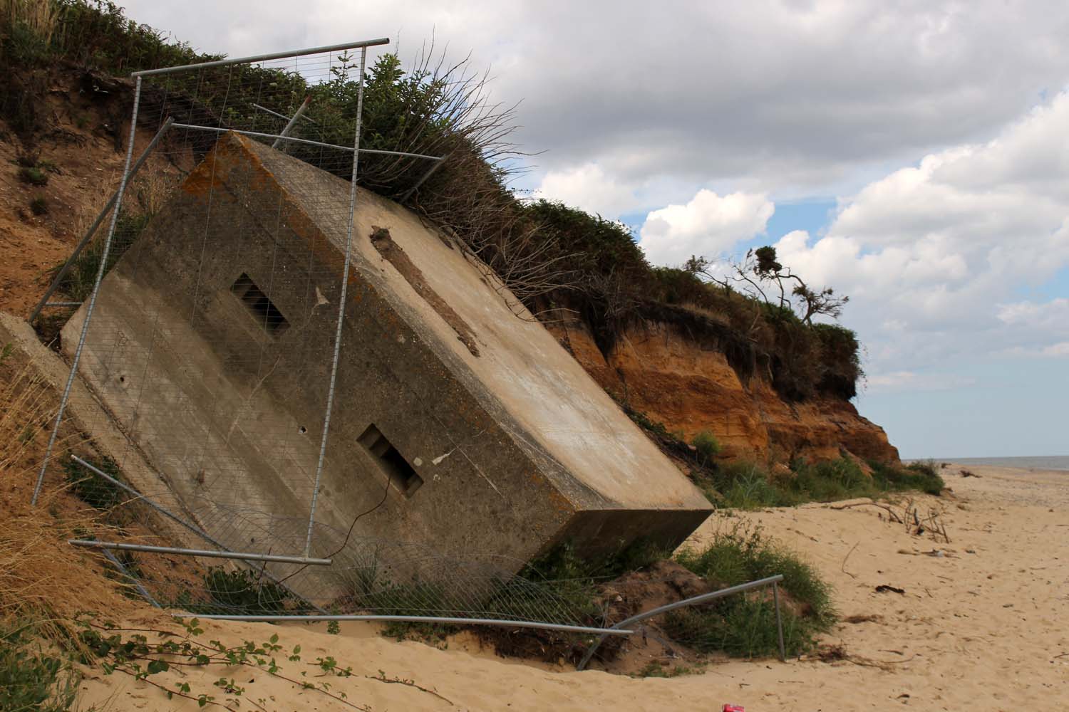 Further south, the cliffs grow a little higher. Ferrous red and as soft and powdery as halva, they are irredeemably at the mercy of the North Sea tide. And it shows: the cliffs are raw and freshly cleaved, with collapsed chunks that have been further eroded by the incoming tide such that they appear to seep from the cliff bases like congealed gravy. Man-made objects receive no preferential treatment – a collapsed WWII concrete defence bunker slopes between cliff and sand at one point, its long process of total disintegration still in its infancy as its perches ignominiously at 45 degrees, an involuntary buttress for the flaking cliffs.