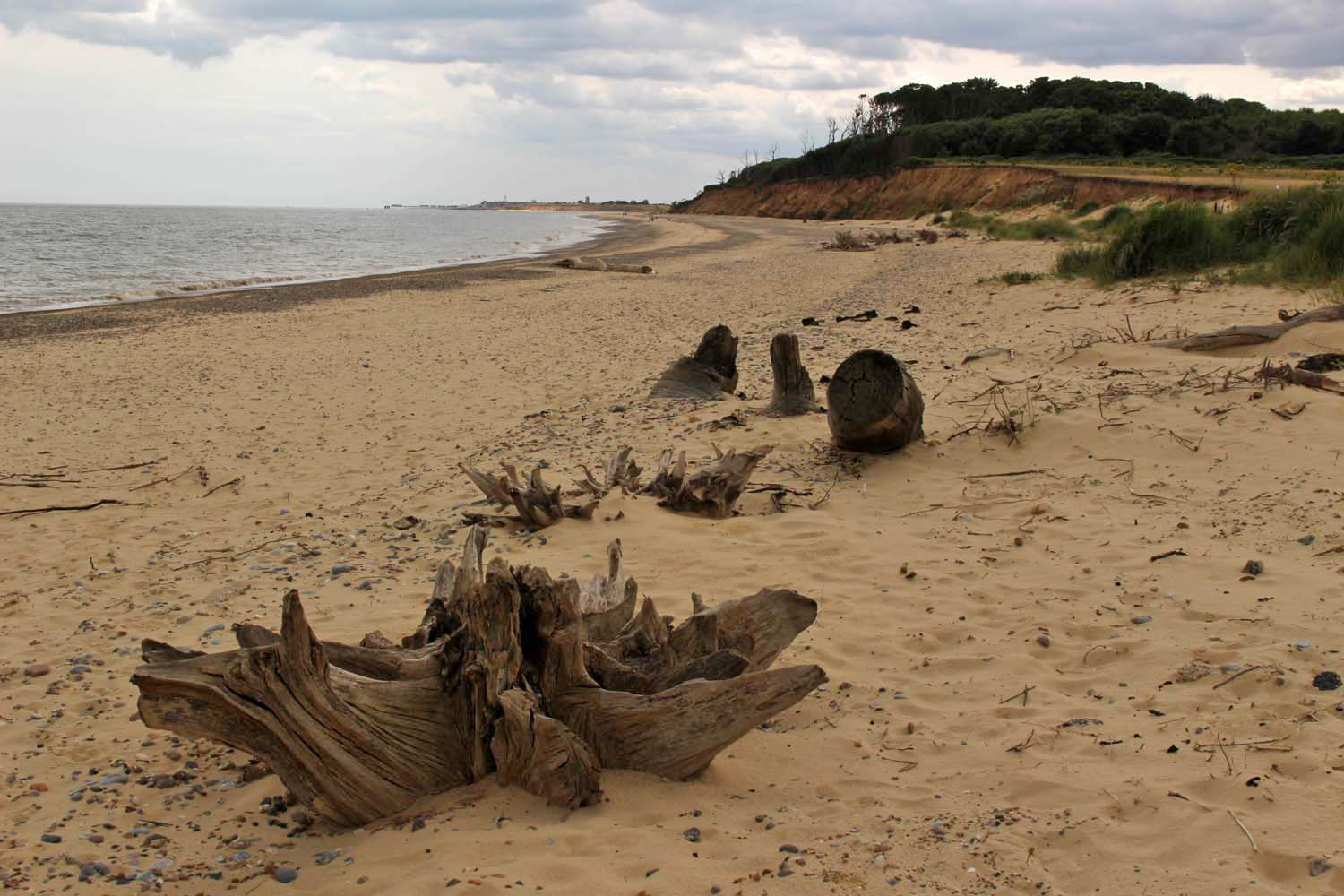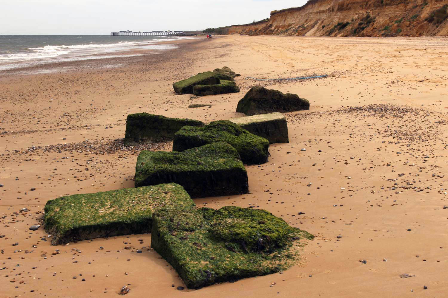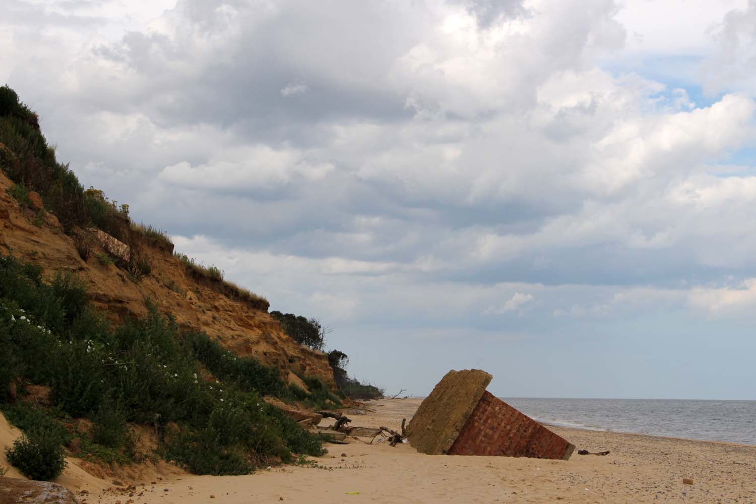 Approaching Southwold, the pier stretching out to sea becomes clearer in detail. The town’s white lighthouse flashes in warning. Beyond the resort, a few miles further south, the gargantuan golf ball of Sizewell B glows uncannily white. Halfway between sea and cliff on the freshly revealing sand are miscellaneous concrete blocks, remains of footings, moorings, buildings. Some of these have been almost completely submerged by sand to leave a line of tiny pyramids like the vertebra of a buried dragon. Frame the scene carefully and squint and this might be an aerial view over the Egyptian desert. The lack of a viable sphinx and presence of a battered clifftop caravan soon disabuses such fantastical musing.