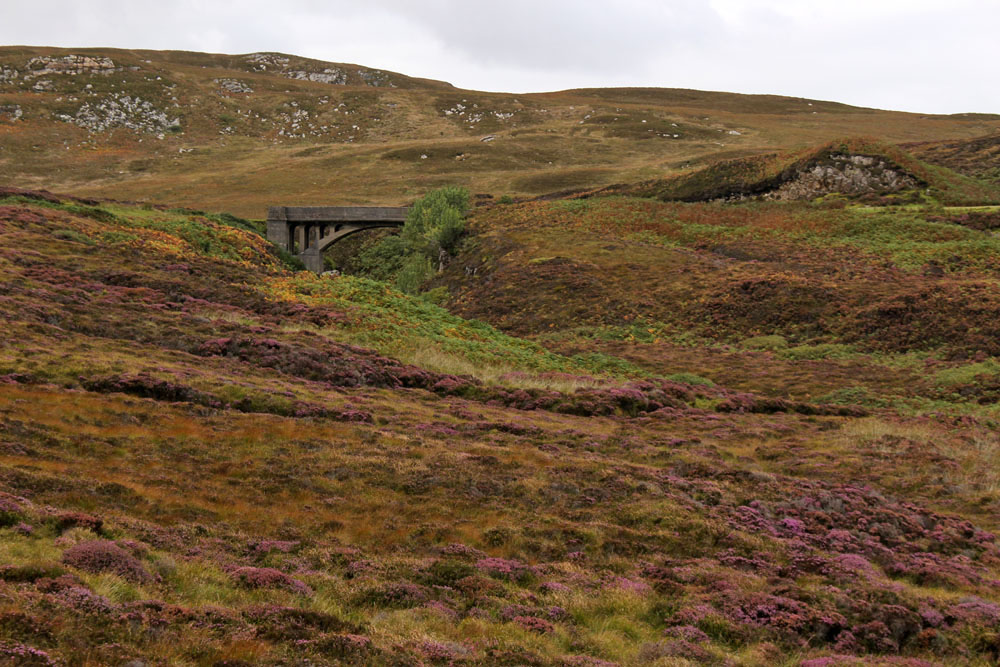 Some fifteen miles from Stornoway, a little way beyond the small coastal village of Tolsta, is Garry Beach, a quiet sandy beach with its own car park. A few campervans are parked up here and a rusty caravan is tethered in a boggy field alongside, more likely a base for itinerant workers than a low-rent holiday home. A couple, well wrapped-up against the cool on-shore breeze, are exercising their dog on the beach. A couple of jagged sea stacks rise vertiginously just offshore; half a dozen oystercatchers methodically work the tideline, red beaks wrestling with molluscs. The asphalt road, single track since Tolsta, ends abruptly at the car park and continues only as a rough peat-digging track that winds up the hillside towards a concrete structure. Walk up here and you soon come to it — a bridge over a narrow gorge that, counter-intuitively, appears to be the very end of the road.