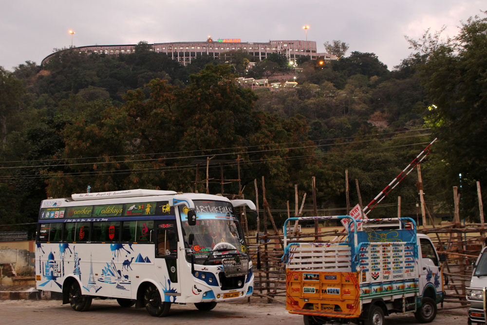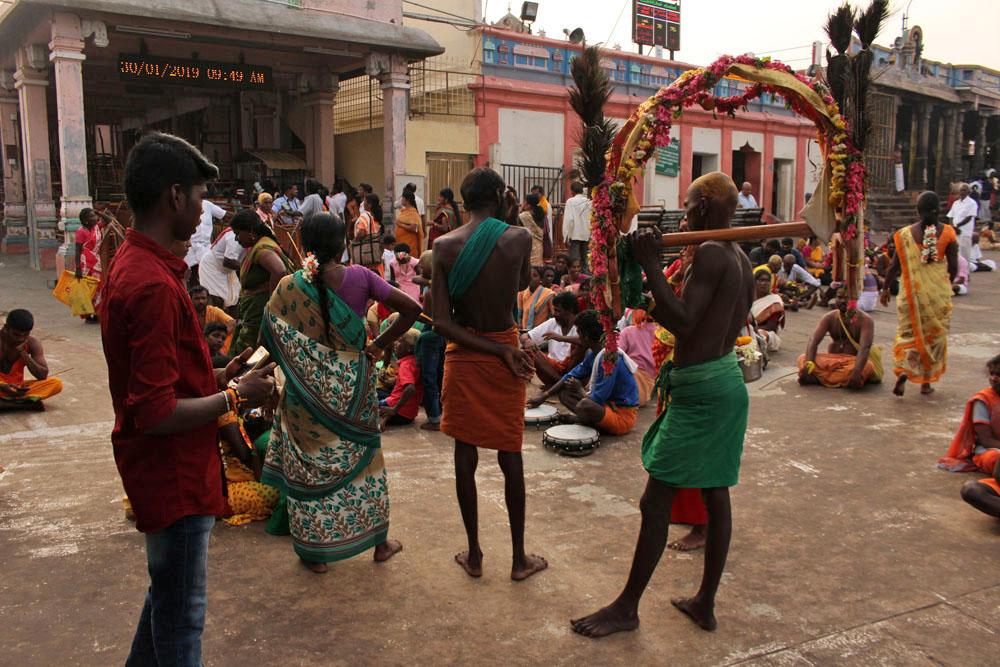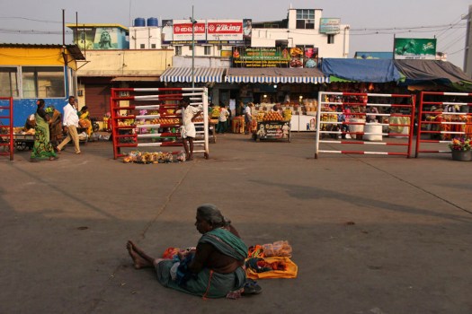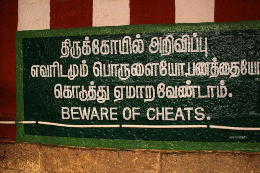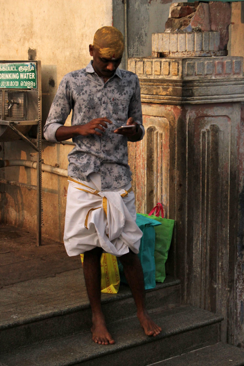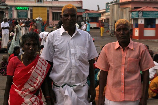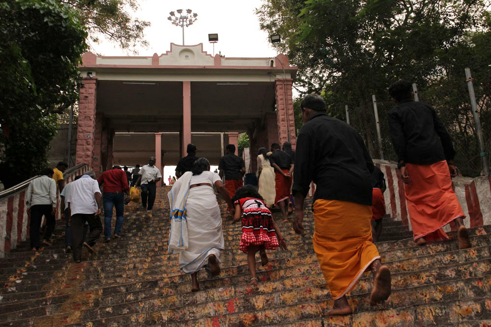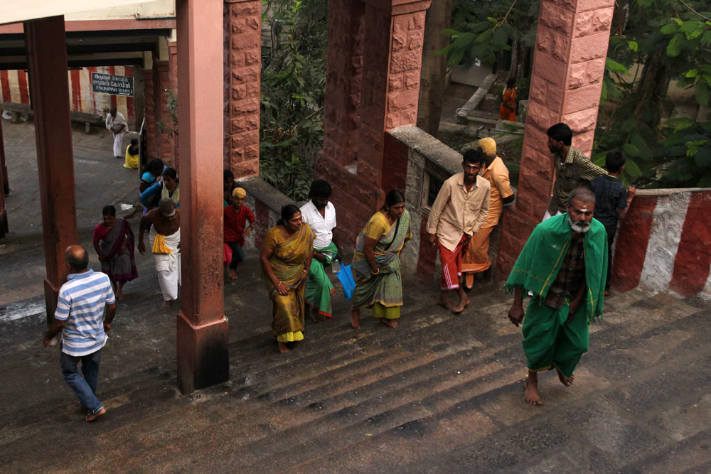 We arrived in the town just as it was starting to get dark – enough time to have something to eat and wander around the market stalls that stood at the base of the steps that led up to the hilltop temple. The temple, dedicated to the god Murugan, was clearly a big draw for south Indian pilgrims and all the necessary facilities were in place to service their needs. As well as numerous ‘hotels’ offering ‘Pure Veg’ food and a mass of stalls selling mass-produced trinkets and cheap jewellery, a large sign outside a booth offered an ‘Ear Boring’ service, while another advertised itself as ‘Tonsure Centre’, a place dedicated to providing the correct sort of haircut – head shaven with an application of sandalwood paste – for dutiful pilgrims.
