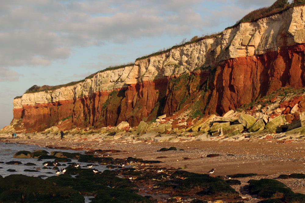 Approaching Hunstanton, the resort slowly came into focus as the mist started to clear. Soon after, a hazy disc of sun shone through and fragments of blue sky began to piece together overhead. By the time we reached Old Hunstanton the transformation was complete – perfect light to appreciate the banded cliffs that rise here. Some unknown hand had created a piece of citizen landscape art on the beach – a collection of painstakingly assembled cairns of red and white chalk that echoed the cliffs of the backdrop. On the shoreline, oystercatchers perched companionably on seaweed-covered rocks while sanderlings scurried like clockwork toys and turnstones did exactly what their name suggests. A scene to savour, albeit briefly – by the time we turned around to walk back into town fog was already starting to descend once more.