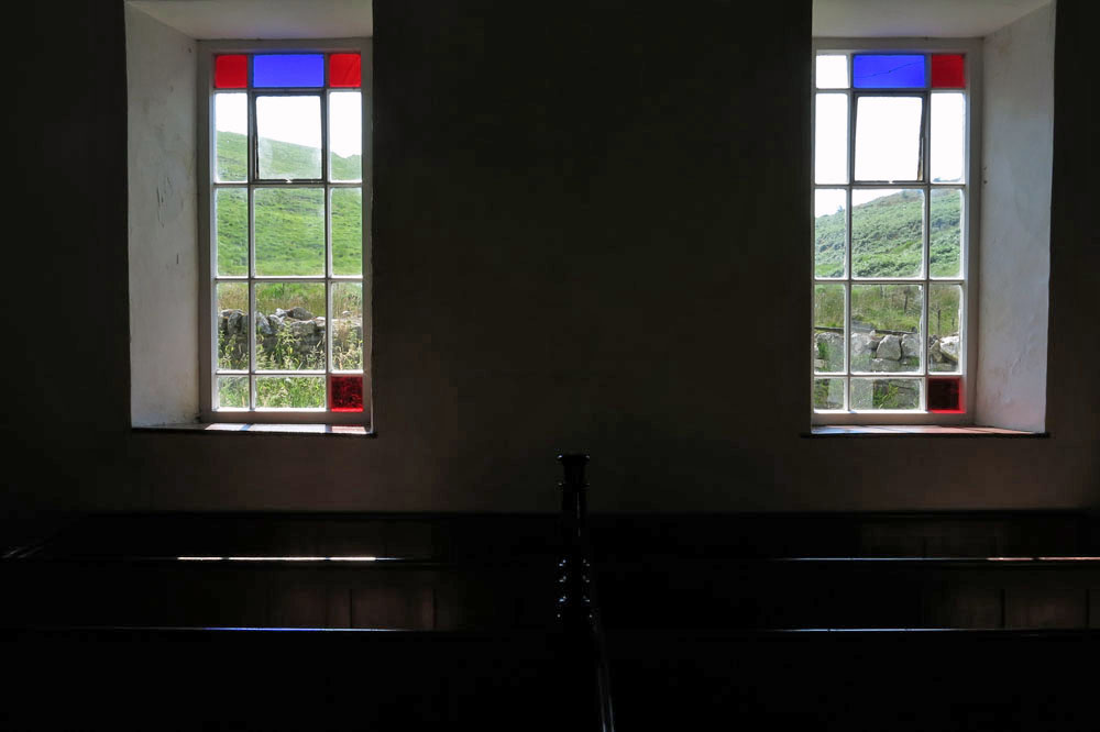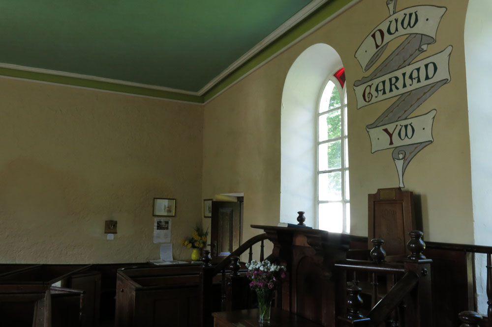 The chapel interior is simple, not exactly austere but unfussy: tightly packed wooden benches dappled with red and blue light from the Mondrian-esque stained glass; plain walls that seem to resonate with earnest drovers’ prayers and ancient Welsh voices. On one of the walls a painted scroll bears the simplest of messages: Duw cariad yw (‘God is love’).