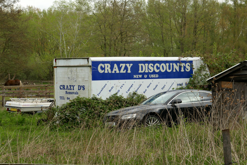 White Hart Lane gives way to Gas House Drove, a narrow lane that traces the back walls of gardens. More paddocks stretch away towards the river to the left; ponies graze unworriedly. There are notices attached to field gates that request visitors not to feed the horses; other signs inform would-be horse thieves that the animals are electronically tagged and fully traceable – the equine equivalent of ‘no cash left in this vehicle overnight’. Further on, beaten up caravans and abandoned rusting cars enhance the edgeland feel – a seldom observed zone where the accepted rules of orderliness do not apply.