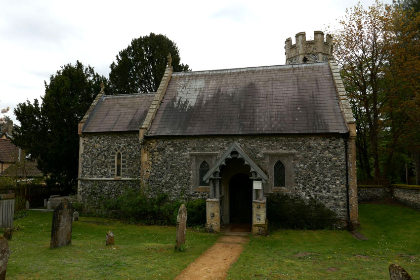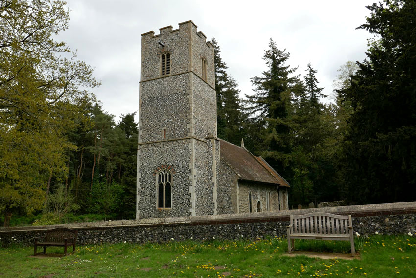 The river is not far away and I end up at the footbridge by the St Helens Picnic Site on the Norfolk bank. A group of youths with rucksacks are lounging by the water and I identity them as Duke of Edinburgh award initiates although I could be wrong. A few minutes later they march off together in an easterly direction, some individuals clearly more enthusiastic than those who straggle at the rear. A little further along the road is Santon House where the tiny Church of All Saints stands complete with tiny turreted tower. I take a quick look inside before sitting on a bench outside to eat the sandwich I had brought with me. A chaffinch sings perched on the very top of a pine tree, cock of the walk, although the jackdaws shuffling proprietorially around the picnic site probably think differently.