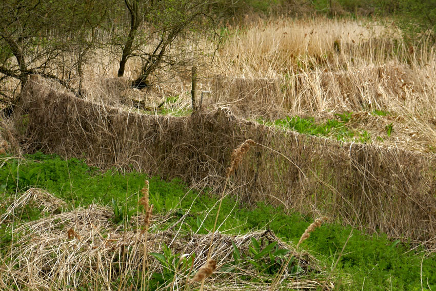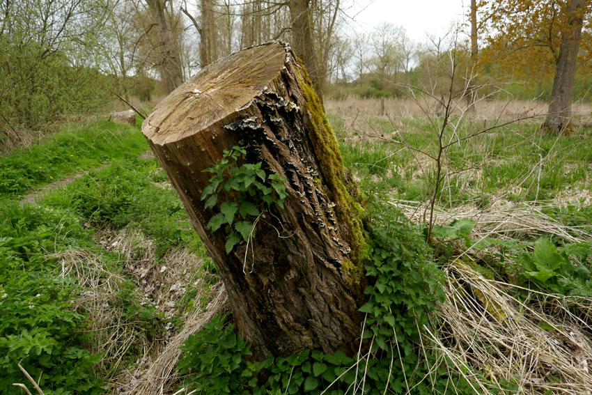 Back at the St Helen’s footbridge, instead of crossing back to the Suffolk side I follow the path that leads west along the river’s north bank. A few hairy Highland cattle are slumped in the long grass of the meadow between the road and river. Mature willows line the riverbank; it looks like perfect otter territory but these are elusive creatures and I see no sign of them. Reaching the bridge at Santon Downham I decide to continue along same river bank all the way back to Brandon. Although the path is well-defined and firm underfoot, the surrounding landscape is pleasingly unkempt, with plenty of rotting timber and tangled dead grass that has weaved itself into a carpet over posts and fences. Nature, I am told, thrives on untidiness such as this.