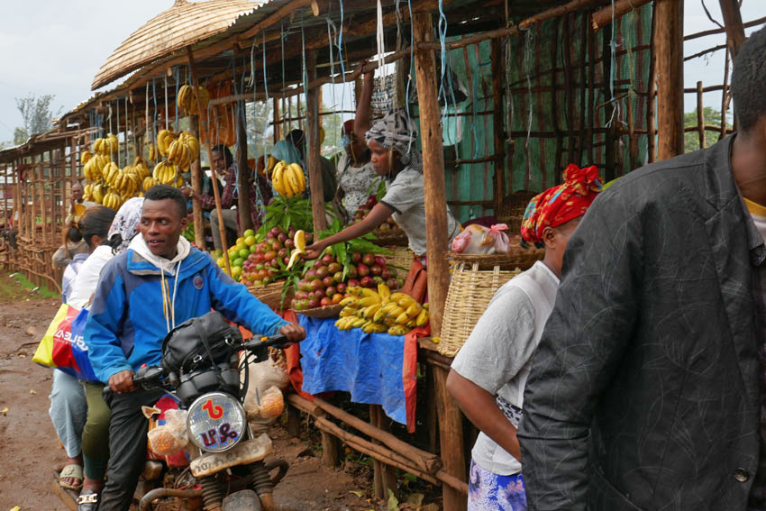 We passed through an endless parade of villages that had little to differentiate themselves from one other: a blurred flash-by of roadside settlements, all flimsy housing and lean-do shops thrown together out of scrap wood, plastic sheets and corrugated iron. The goods on sale – fruit and vegetables, flyblown meat, second hand clothes, spare parts for vehicles – were the bread and butter (or, perhaps, injera) of everyday life. As always in the Global South, it was intriguing how such a base-level financial system managed to thrive, a poor man’s economy in which ragged ten birr notes continually changed hands until all the value had been squeezed out of them.