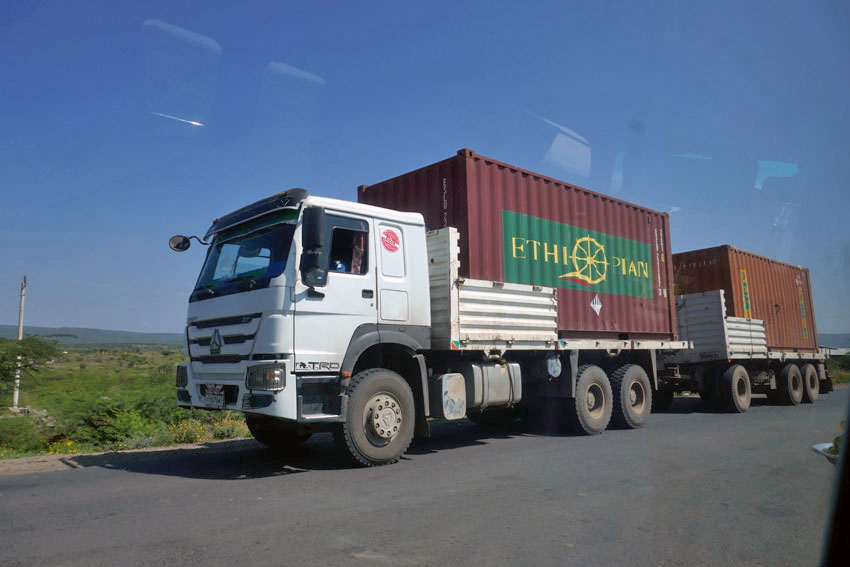 For the first hour or so we sped along a pristine tarmacked dual carriageway, the brightening horizon ahead weighed down by clouds the colour of watermelon juice. We could have been almost anywhere; or, at least, anywhere that comes blessed with a backdrop of purple-shadowed mountains and lush tropical greenery. Eventually the freeway morphed into a narrow two-lane highway, which meandered around the heads of valleys as we plied our way eastwards. Traffic was heavy in both directions. Coming towards us was an endless stream of heavily laden trucks from Djibouti, each one towing a trailer, vehicle and driver bonded in lockstep like driven cattle. We slotted into a gap in the fast moving crocodile of trucks that were heading east towards the coast, some of which were piggybacking another truck strapped to their flatbed.