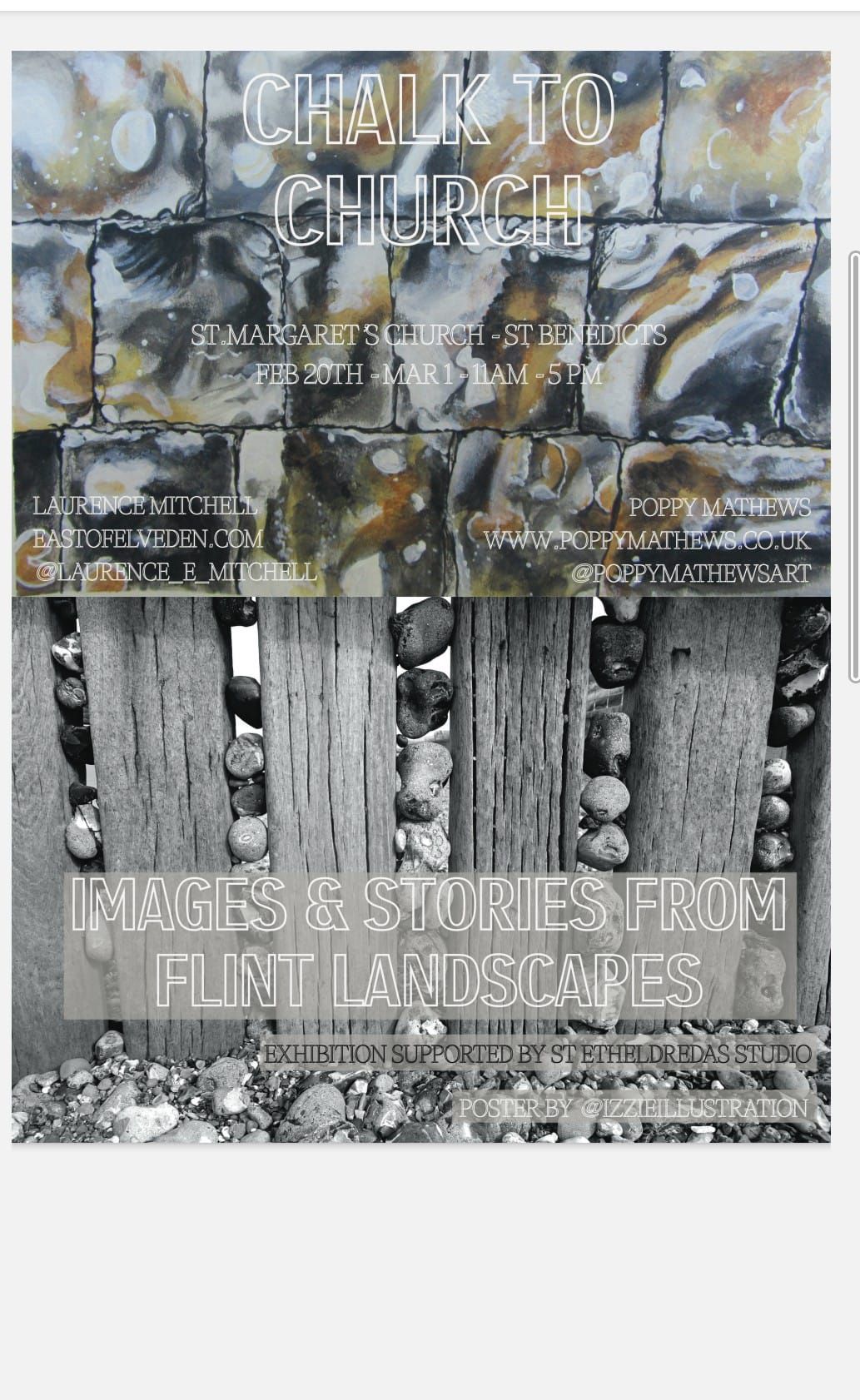 I am currently involved in an art exhibition at St Margaret’s Gallery, St Benedicts St, Norwich. The exhibition is mixed media, with paintings by Poppy Mathews (@poppymathewsart) and photographs and text by me. It is all very flint-themed and, for my part at least, relates closely to my recent book. Some of the text is taken from the book, Flint Country; some was written specifically for the exhibition.