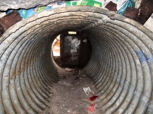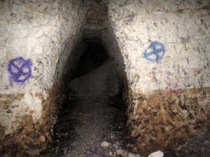 Just a few metres beyond the entrance the absolute darkness is intimidating – the light of torches too feeble to identify much more than where the tunnel floor is and highlight spray-painted ciphers marking dead ends and potential exit routes. The photos taken here with flash were made by simply pointing and hoping for the best: a strange turn of events in which the results reveal detail unseen by dim yellow torchlight at the time of their taking.